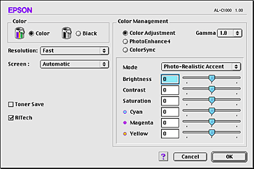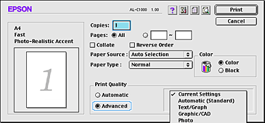 When the Automatic radio button is selected on the Basic Settings dialog box, the printer driver takes care of all detailed settings according to the color setting you select. Color is the only setting you need to make. Most Macintosh applications feature Paper Size and Orientation settings which override similar settings in the printer driver, but if your application does not, you should verify the settings in the printer driver.