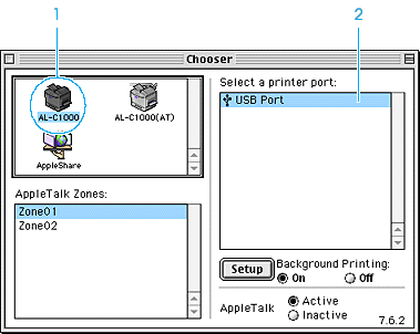 | Select Chooser from the Apple menu. Click the AL-C1000 icon and then click the USB port your printer is connected to. |