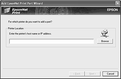 For Windows 2000: Click Local printer, clear the Automatically detect and install my Plug and Play printer check box, and then click Next. Select the Create a new port radio button, and then select EpsonNet Print Port from the list. Click Next.