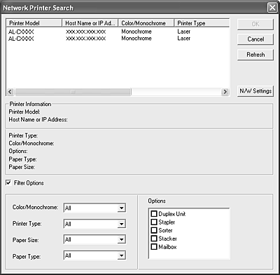If you want to search specific printers, click the Filter Options check box, and then specify your favorable options.