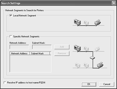 If you want to search printers in other segments, click the N/W Settings button. Select the Specific Network Segments check box, and then enter the network address and subnet mask of the network segment for the search. Then click the Add button. If you want to resolve the IP address to the host name or FQDN, select the Resolve IP address to host name/FQDN check box.