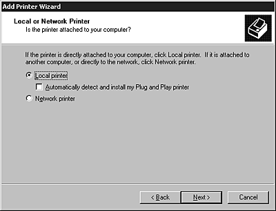 You must clear the Automatically detect and install my Plug and Play printer check box because the printer is attached directly to the network, not to a Windows 2000 computer.