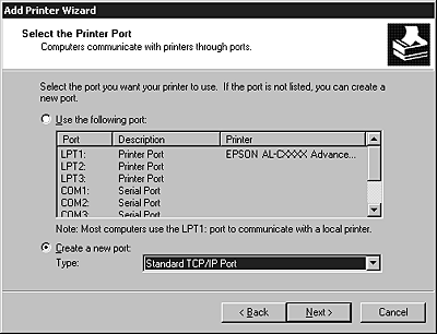 Select the Create a new port radio button, and then select Standard TCP/IP Port from the list. Then click Next.