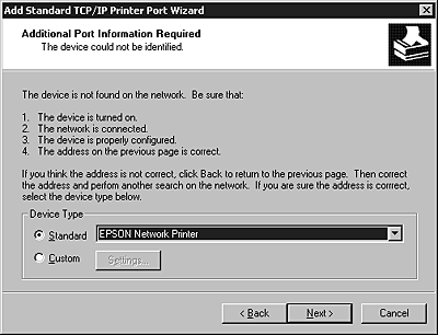 If an error occurs, the following dialog box appears. Select the Standard radio button and then select EPSON Network Printer. Click Next.