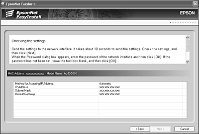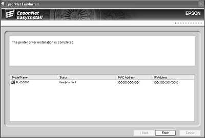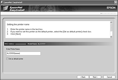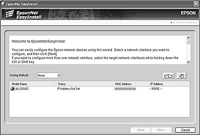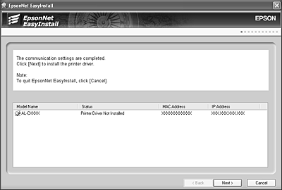 | EpsonNet EasyInstall starts. Select the printer and then click the Next button. |