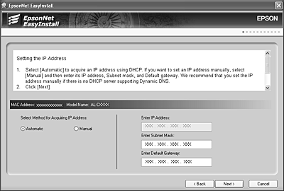 | Select a method for specifying the IP address. If you select Automatic, DHCP becomes available and assigns an IP address automatically. If you want to set the IP address manually, select Manual and then enter the IP address, subnet mask, and default gateway. Click the Next button. |