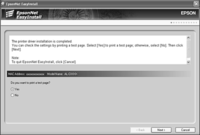 | Select Yes to print a test page; otherwise, select No. Click the Next button. |