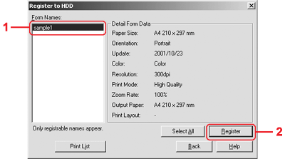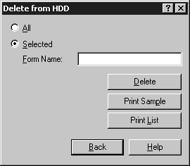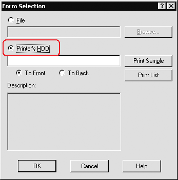 Click Printer's HDD, and then enter the registered form name. If you need a list of the registered form overlay data, click Print List to print it, and then check the form name. Also, if you need a sample printout of the form overlay data, enter the form name and then click the Print Sample button.