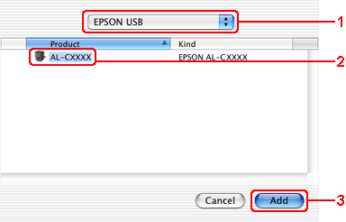 Select EPSON USB from the pop-up menu. Select your printer icon in the Product list, then click Add.