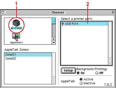Select Chooser from the Apple menu. Click your printer’s icon, then click the USB port your printer is connected to.