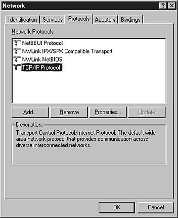 To use NetBEUI, select the Protocols tab and then click Add. Select NetBEUI from the list and then click OK.
