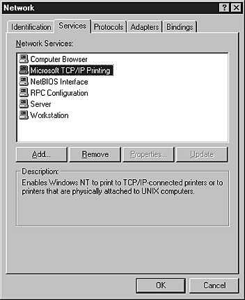 Select the Services tab and then click Add. Select Microsoft TCP/IP Printing from the list and then click OK.