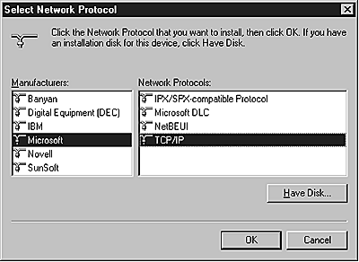 Select Microsoft from the Manufacturers list and TCP/IP from the Network protocols list. Then click OK.
