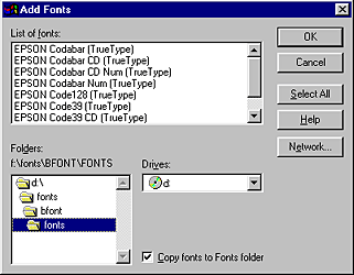 | In the List of fonts box, select the BarCode Font you want to install, or click Select All to install all EPSON BarCode Fonts. |