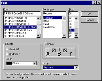 | Select the EPSON BarCode Font you want to use, then set the font size and click OK. |