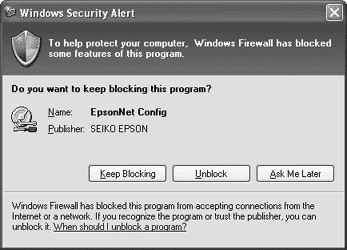 If the following screen appears after you start EpsonNet Config, click the Unblock button; otherwise the devices are not listed on the screen of EpsonNet Config.