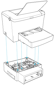 Make sure that the printer and the cassette unit are facing the same way. Lift the printer and align the pins on the cassette unit with the holes on the bottom of the printer, then lower the printer until it rests securely on the cassette unit.
