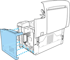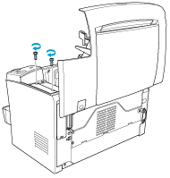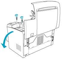 Face the right side of the printer, and using a cross-head screwdriver, remove the two screws holding the side cover in place. Remove the side cover by pulling it toward you.