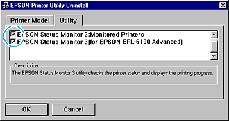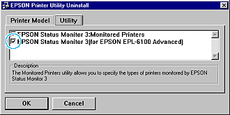 | If you uninstall the Monitored Printers utility, select the EPSON Status Monitor 3: Monitored Printers check box and click OK. |