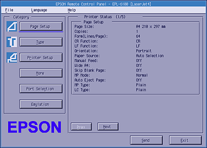 Select the emulation mode you want to configure and click OK. The main Remote Control Panel screen that appears varies slightly, depending on the emulation mode you select. The example below is that for the LaserJet4 emulation mode.