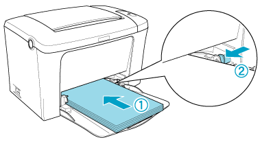 Fan a stack of paper and tap it on a flat surface to even the edges, and set the paper into the MP tray with the printable surface facing up. Then adjust the paper guide to the size of the paper.
