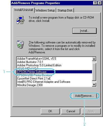 When using Windows XP/2000, click Change or Remove Programs, select the EPSON Printer Software, then click Change/Remove.