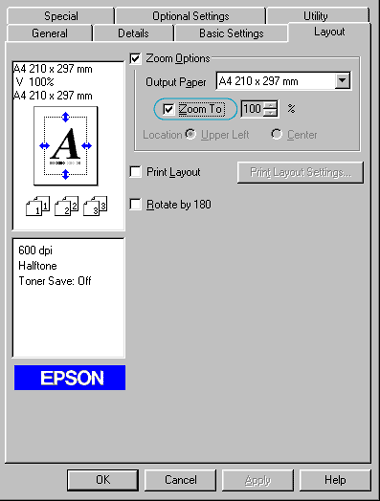 Select Upper Left for Location to print reduced page image at upper left corner of the paper. Select Center to print reduced page image with centering.