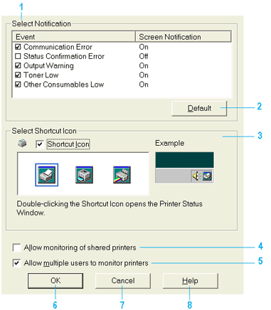 If the Monitored Printer settings are not available on a computer set up for multiple users, make sure that the Allow multiple users to monitor printers check box is selected in the Monitoring Preferences dialog box.