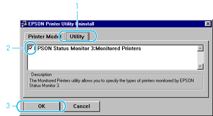 You can uninstall only the utility for Monitored Printers of EPSON Status Monitor 3. When that utility is uninstalled, you cannot change the setting of the Monitored Printers from the EPSON Status Monitor 3 utility of other printers.