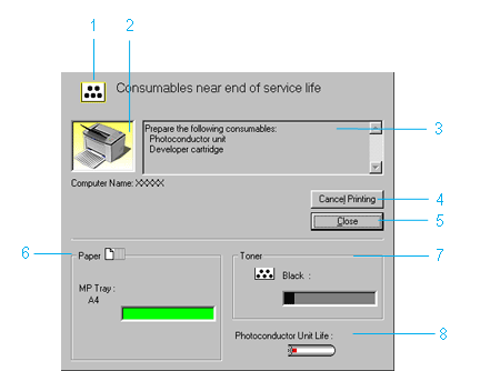 The EPSON Status Monitor 3 is a utility program that monitors your printer and gives you information about its current status. For example, you can find out the amount of remaining toner through this utility. If a print error occurs, the utility provides you with a message describing the error. The EPSON Status Monitor 3 is accessed from within the printer driver. See the following section for more information.