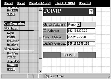 After you have configured the Internal Print Server for TCP/IP using printer's control panel, EpsonNet WinAssist, MacAssist, or the arp/ping command, you can make changes to the IP address or other settings using EpsonNet WebAssist (a utility that runs on your browser).