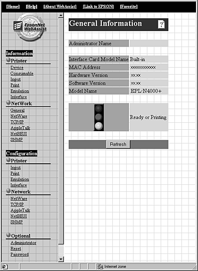 | When using Internet Explorer or Netscape Navigator in Macintosh or Netscape Navigator in UNIX, or when EpsonNet WebManager 1.00aE shipped with the EPSON interface card is installed in your computer, the Information-Printer and Configuration-Printer settings may not be available. Use the printer's control panel to make these settings. |