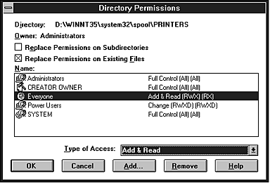 You need to change the access rights of the spool directory when you create a shared printer on the Windows NT 3.51 Server (if you have set up your computer to use an NTFS file system, rather than a FAT file system).