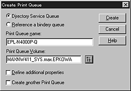Click the directory context icon, and select Create from the Object menu, then Print Queue. Type the Print Queue name and select the Print Queue Volume. Then click Create. Then double-click the print queue object, and register the user.