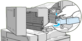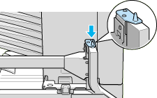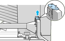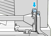 Align the two pins on the side bracket with the holes on the right side as shown below. Insert the pins into the Large Capacity Paper Unit, then lower the bracket until it is firmly attached.