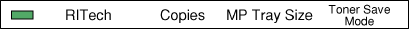 To enter OneTouch mode 2, press the SelecType button (repeatedly if necessary) until the indicator light next to RITech comes on. The current OneTouch mode 2 settings for RITech, Copies, MP tray Size, and Toner Save Mode are shown on the display panel in this order.