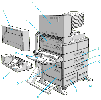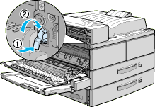 | Open cover A on the left side of the printer. If the optional Duplex Unit is installed, open cover DM first, then open cover A. If the optional Envelope Feeder is also installed, remove it before opening the Duplex Unit. |
