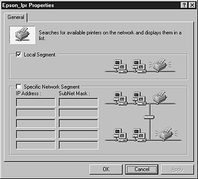 Select Local Segment to search a printer in the same segment, or select Specific Network Segment and enter the IP address and subnet mask of the printer to find a printer located beyond the router. Click OK.