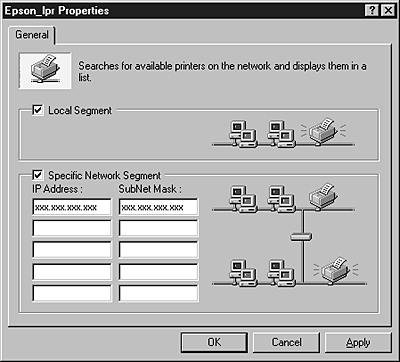 Select the Specific Network Segment check box and enter the IP address and subnet mask of the printer you want to find. Click OK.