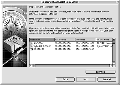 If the same printer model name appears several times on the list, you can identify the printers by checking their MAC addresses, which are found on the status sheet.