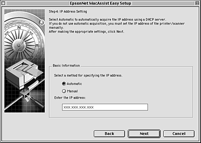 When you assign an IP address manually, we recommend you use EpsonNet MacAssist to set the subnet mask and default gateway.