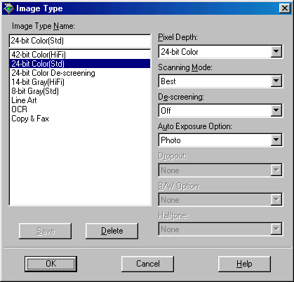 To save the settings you made as a group of custom settings, type a new name in the Image Type Name box, then click Save. To delete a custom Image Type setting, select the setting name then click Delete.