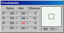 The Densitometer shows the RGB and luminosity (L) values of a selected pixel or group of pixels, and indicates the difference between these values before and after making adjustments to the previewed image.