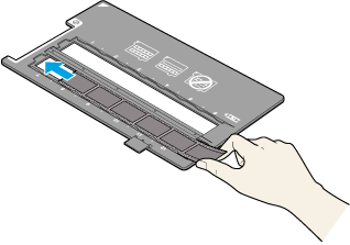 Slide the edge of the strip in the 35 mm film holder, base side facing down. Then place it so that all of the frame is positioned inside the film holder.