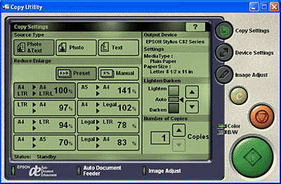 Use this application to turn your scanner into a digital copy machine. The application looks like a real copy machine, yet its functions are far more powerful and flexible than the conventional copy machines. When you launch this application, the following screen appears.