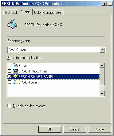 If you need to disable the Scanner events, select the Disable device events check box in the scanner's Properties dialog box.