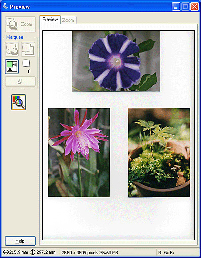 The Normal Preview method allows you to see the entire previewed image and the effects of settings you made, and to make additional image adjustments. You can also use marquees to scan selected portions of an image. For details on marquees, see Using marquees.