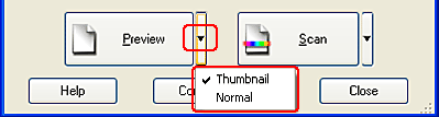 Clicking Preview starts prescanning and previews the image. Depending on the scanning mode and the Document Type settings, a small arrow appears to the right of the Preview button allowing you to select a preview method. Click the arrow and select Thumbnail or Normal to change the preview method.