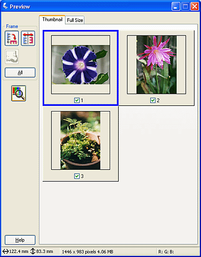 The Thumbnail Preview method allows you to preview multiple images in a thumbnail layout. EPSON Scan automatically locates the target images and applies the Auto Exposure feature to each image. You can modify each thumbnail image and make additional image adjustments. You can also use marquees to scan selected portions of an image. For details on marquees, see Using marquees.