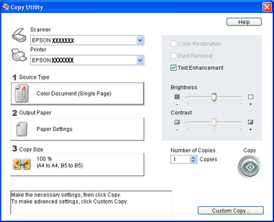 Pressing the Copy button on the scanner starts the Copy utility in the EPSON Smart Panel window if it has not been started yet. The following window appears.